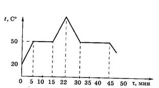 Вещество, взятое в кристаллическом состоянии некоторое время нагревали, затем оно остывало. График зависимости температуры вещества от времени в течение этого опыта изображен на рисунке. Сколько минут в этом эксперименте длился процесс нагревания твердого вещества?
