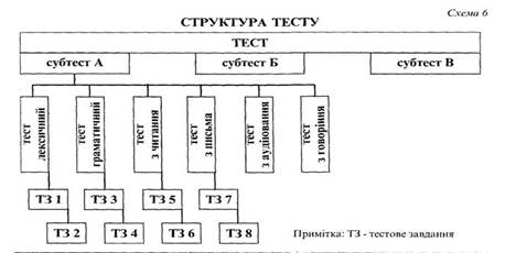 Всередніх навчальних закладах для проведення поточного, рубіжного або підсумкового контролю використовуються тести навчальних досягнень, метою яких є визначення рівня навчальних досягнень учня в оволодінні іншомовною мовленнєвою діяльністю на певному ступені навчання. Тестами загального володіння ІМ є тести типу TOEFL. Діагностичні тести використовуються з метою подальшого розподілу учнів по групах за рівнем підготовки з іноземної мови. Тести на виявлення здібностей до вивчення ІМ спрямовані на визначення конкретних індивідуально-психологічних особливостей учня з метою забезпечення їх своєчасного коригування та розвитку, що сприятиме успішності оволодіння мовленнєвою діяльністю. Тест складається з тестових завдань, які об'єднуються у субтести. До субтесту входять тестові завдання, спрямовані на один конкретний об'єкт тестового контролю, наприклад, визначення рівня володіння вимовними, граматичними або лексичними навичками, уміннями аудіювання, читання, говоріння, письма