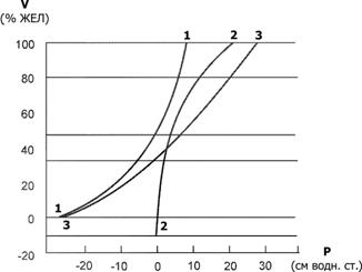 Рис. 25–5. Кривые растяжимости частей дыхательной системы [21]. 1 — грудная клетка, 2 —.лёгкие, 3 — весь дыхательный аппарат.