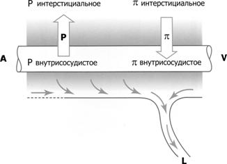 Рис. 25–6. Баланс интерстициальной жидкости межальвеолярных перегородок (иллюстрация к уравнению Старлинга) [4]. Нормально разные силы, действующие на содержание жидкости в интерстиции, приводят к фильтрации жидкости из кровеносных капилляров (A–V). Из интерстиция эта жидкость оттекает по лимфатическим сосудам (L). A — артериальный конец капилляра, V — венозный конец капилляра, P — гидростатическое давление, p — коллоидное осмотическое (онкотическое) давление.