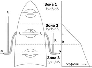 à Зона 3 (Pa > Pv > PA): нижние две трети лёгкого. Здесь перфузию определяет разность между Pa и Pv. Значение PA практически значения не имеет.