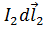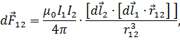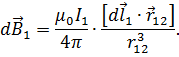 . Тогда по закону Био–Савара–Лапласа индукция магнитного поля, создаваемого 1-ым элементом в точке, где находится второй элемент тока, равна: