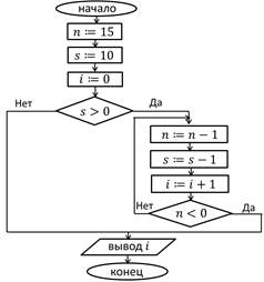 13. (5 баллов) Определите значение переменной i после выполнения следующего фрагмента алгоритма, представленного в виде блок-схемы. В ответ напишите только число.