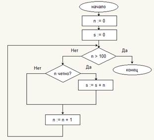 14. (5 баллов) Определите значение переменной S после выполнения следующего фрагмента алгоритма, представленного в виде блок-схемы. В ответ напишите только число.