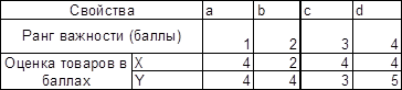 3. На технически сложный товар Х необходимо назначить конкурентоспособную цену. Аналогичный товар Y основного конкурента успешно продается по цене 2 млн.руб./ед. Группа экспертов провела сравнительное тестирование основных свойств этих товаров, а также ранжировала их по важности для потребления, приняв за единицу наименее важное свойство: |