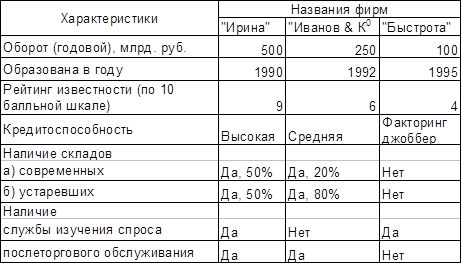 3. Производственное предприятие выпускает новый технически сложный и требующий значительных затрат на перевозку товар на сумму около 500 млрд.руб., а также транспортабельный товар повседневного спроса на сумму около 80 млрд. руб. Какие их трех фирм Вы выберете в качестве дистрибьютора? Известны следующие характеристики фирм: |