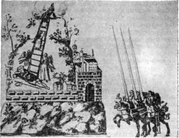 С большим искусством исполнялись и пиротехнические фокусы. Огонь применялся во время пыток в аду. Особенно эффектными были пожары, когда от гнева божьего в день страшного суда загорались дома или во время штурма пылали крепости. Но наряду с иллюзией натурального огня в мистериях применялось и условное обозначение света. Так, отделение света от тьмы изображалось полотнищем — белым и наполовину черным, которое затем с треском разрывалось пополам.