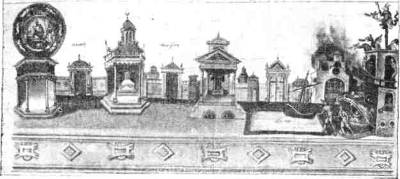 На миниатюре Жака Фуке (1460) изображено в разрезе устройство мистериалъной сцены кольцевого типа (см. рис. нэ стр. 81). На сваях, вбитых по кругу, настлан сплошной помост, на котором сооружены обособленные друг от друга отделения. В «отделениях» расположены — справа рай, затем место для оркестра, дворец императора, две ложи для дам, в крайнем отделении слева находился ад—двухэтажная башня с входом в виде раскрытой пасти дракона. Основная масса зрителей стояла под