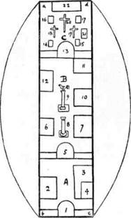 1 1. Первые ворота. 2. Ад. 3. Гефсиманский сад. 4. Елеонская гора. 5. Вторые ворота. 6. Дом Ирода. 7. Дом Пилата. 8. Столб для бичевания Христа. 9. Столб с петухом. 10. Дом Кайафы. 11. Дом Анны. 12. Дом Тайной Вечери. 13. Третьи ворота. 14, 15, 16, 17. Могилы. 18, 19. Кресты разбойников. 20. Крест Христа. 21. Могила Христа. 22. Небо.