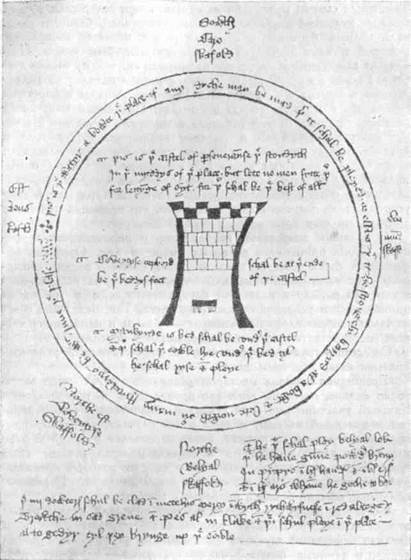 Более распространенной формой сценического устройства была система кольцевого оформления. Этот принцип амфитеатра перешел в средние века от театральной архитектуры древних, которая была хорошо известна по развалинам в Бурже, Арле, Орлеане и других городах. Такой тип постановки мистерии в кругу амфитеатра был распространен в некоторых местностях Англии (например, в Корнуэльсе), причем в ряде случаев он встречался также в постановках моралите (см. рис. на стр. 77).
