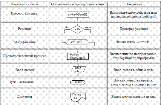 Для наглядного представления алгоритма широко используется графическая форма – блок-схема, которая составляется из стандартных графических объектов. При графическом представлении алгоритм изображается в виде последовательности связанных между собой функциональных блоков, каждый из которых соответствует выполнению одного или нескольких действий. В блок-схеме каждому типу действий (вводу исходных данных, вычислению значений выражений, проверке условий, управлению повторением действий, окончанию обработки и т.п.) соответствует геометрическая фигура.