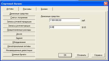 Рис. 6. Окно «Стартовый баланс» вкладка «Денежные средства»