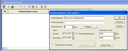 Рис. 12. Окно "Редактирование этапа проекта" из меню "Календарный план"