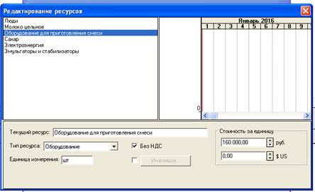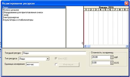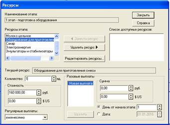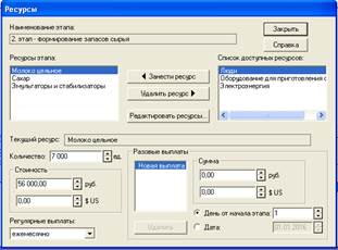 Рис. 16. Окно "Ресурсы" из меню «Редактирование этапа проекта» этапа "Формирования запасов сырья"