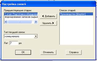 Ø В открывшемся окне Настройка связей перенести из окна Список стадий в окно Предшествующие стадии с помощью кнопки Добавить стадии «Подготовка оборудование», «Формирование запасов сырья» и указать длительность 7 и 6