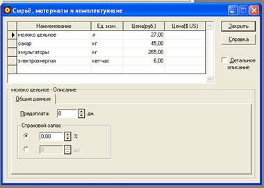 Рис. 22. Окно "Сырье, материалы и комплектующие" из меню операционный план