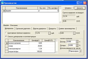 Ø В окне Производство активизировать закладку Материалы, включить переключатель Список материалов и комплектующих. Щелкнуть мышью в нижней части окна, где находится таблица "Наименование, Цена (руб.), Цена ($US)", нажать клавишу INS. Откроется окно со списком сырья и материалов, выбрать материал и нажать ОК. Данные по материалу будут перенесены в окно Производство, в правой части окна ввести "Расход", т.е. количество расхода материала из таблицы 3. Чтобы ввести данные по другому материалу, каждый раз необходимо нажимать клавишу INS. Последовательно перенести данные из таблицы 3.