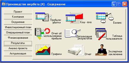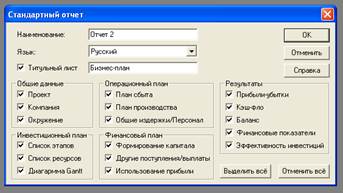 Ø В окне меню Результаты с помощью последовательности кнопок Отчет->Добавить->Стандартный создать стандартный отчет по бизнес-плану, просмотреть, напечатать.
