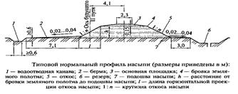 Типовой нормальный профиль насыпи приведен на рис. 8. Верхняя часть, на которую укладывают балласт, шпалы и рельсы, называется основной площадкой. На однопутных линиях основная площадка имеет форму трапеции с шириной верхней части 2,3 м и высотой 0,15 м, а на двухпутных — форму равнобедренного треугольника высотой 0,2 м. Такое очертание основной площадки способствует стоку воды, проникающей через балластный слой во время дождя и таяния снега.