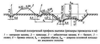 Типовой поперечный профиль выемки приведен на рис.9. Основная площадка выемки имеет такие же размеры, как у насыпи. С каждой стороны основной площадки земляного полотна в выемках создают продольные канавы для отвода воды, называемые кюветами. Они характеризуются следующими минимальными значениями параметров: глубина 0,6 м, ширина (по дну) 0,4 м и продольный уклон дна 0,002.