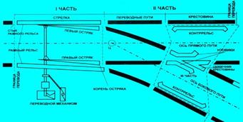 Стрелка включает в себя два рамных рельса, два остряка, предназначенные для направления подвижного состава на прямой или боковой путь, и переводной механизм.