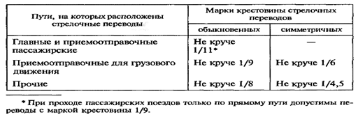 В зависимости от назначения пути используют стрелочные переводы с крестовинами, имеющими следующие марки: