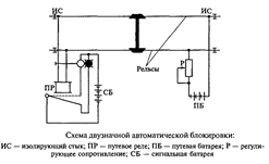 Для уяснения принципа смены сигнальных показаний на рисунке приведена упрощенная схема двузначной автоблокировки с рельсовыми цепями постоянного тока. Рельсовые цепи отделены друг от друга изолирующими стыками ИС. Источником тока в рельсовой цепи является путевая батарея ПБ, потребителем тока — путевое реле ПР.