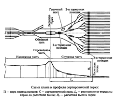 В профиле спускная часть проектируется по расчетной схеме, состоящей из девяти элементов с уменьшающимися уклонами: от первого скоростного крутизной 0,050 до уклона крутизной 0,0006 на сортировочных путях между третьей (парковой) тормозной позицией и расчетной точкой.