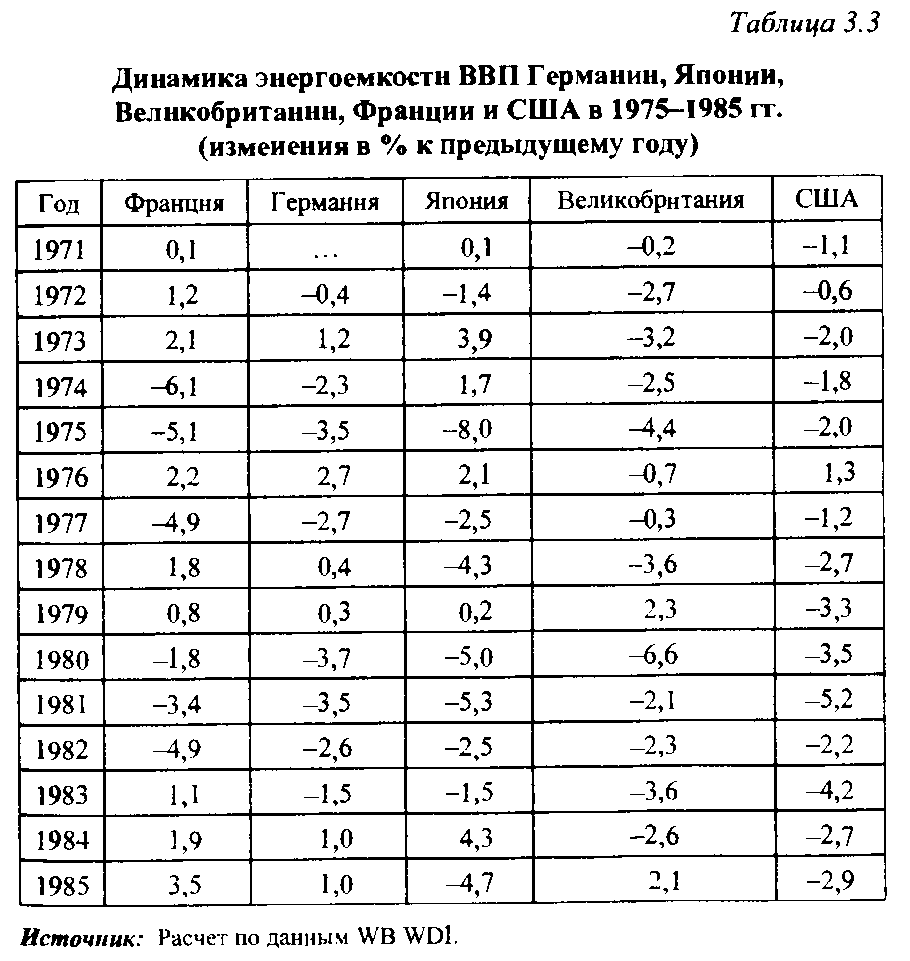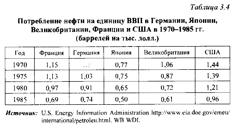 Страны - потребители нефти, столкнувшиеся с 1973 г. с резким повышением цен на нефть, связанным с этим ускорением инфляции, замедлением экономического роста, начинают снижать энергоемкость производства и потребления (табл. 3.3).