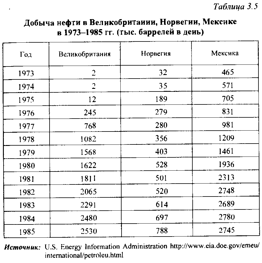 Несмотря на это, цены на нефть с 1 квартала 1981 г. снижаются. Сначала этот процесс идет медленно. Цена составляла 31 долл. 76 центов в 1982 г., 28 долл. 67 центов в 1983 г. К 1984-1985 гг. она снизилась до 27 долл. (в текущих ценах)[202]. К 1985 г. Саудовская Аравия сократила производство нефти до 2,5 млн баррелей в день. Это почти в 4 раза меньше уровня 1981 г.[203].