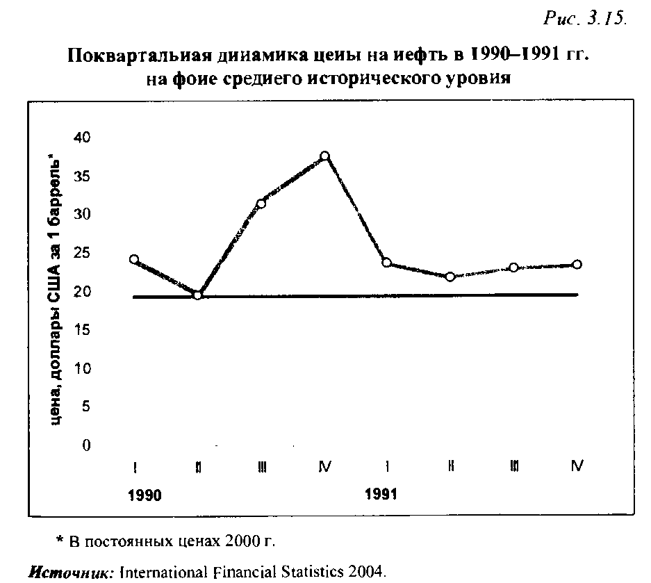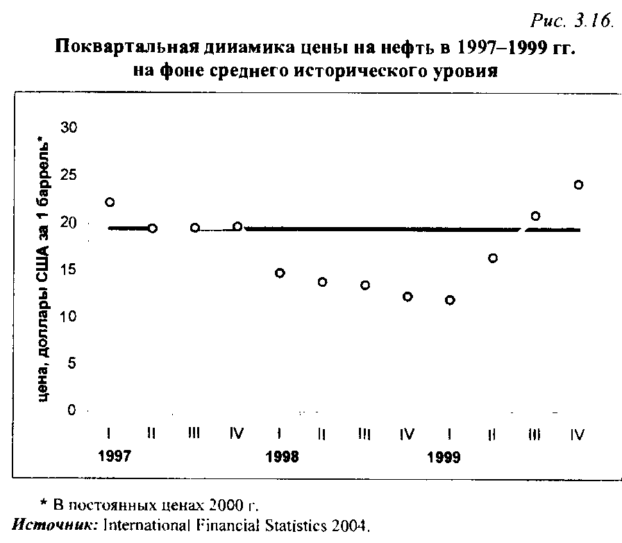 До 2000 г. резкие падения и повышения цен, связанные с политическими событиями (война в Персидском заливе) и финансовыми потрясениями (кризис в Юго-Восточной Азии), приводят лишь к краткосрочным отклонениям от среднего многолетнего уровня (рис. 3.15 - 3.16).