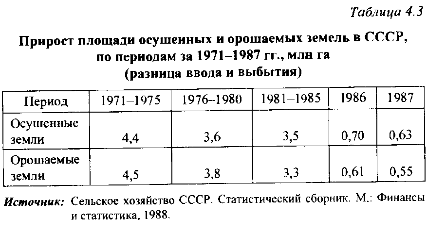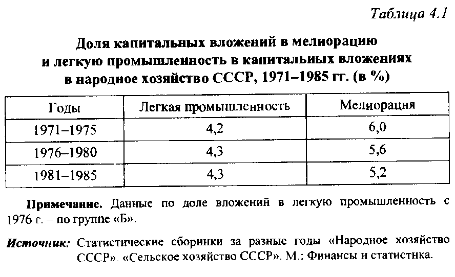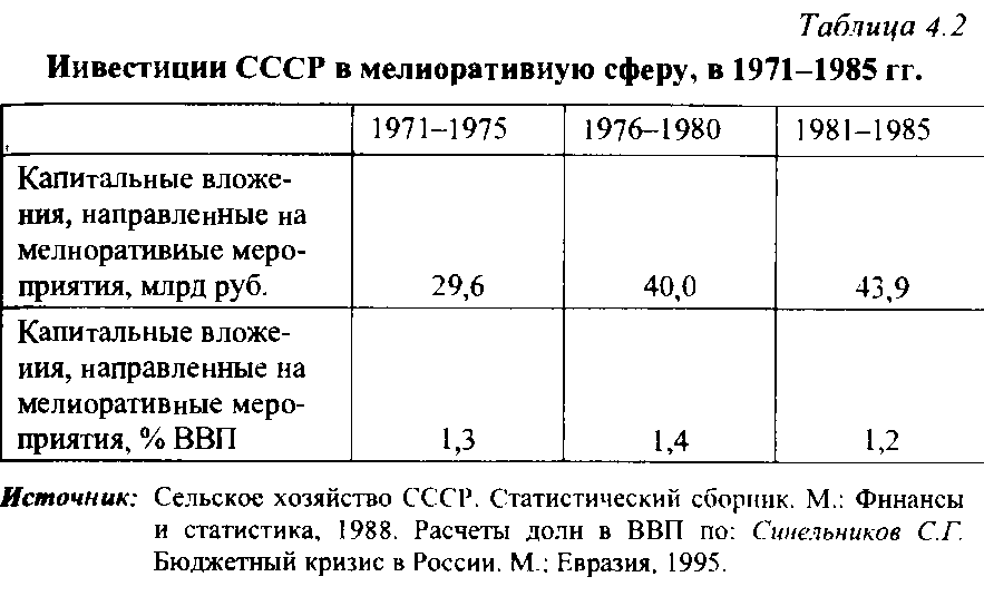 Многие проекты, в которые вкладывались значительные ресурсы, оказывались либо малоэффективными, либо бессмысленными. Характерный пример - мелиоративное строительство. По объему капитальных вложений эта отрасль опережала легкую промышленность (см. табл. 4.1, 4.2)