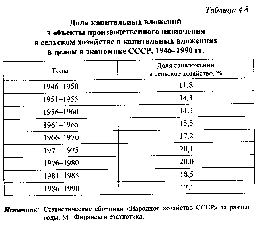 Казалось бы, естественный ответ на нарастание трудностей в обеспечении населения продовольствием - использование созданного промышленного потенциала для наращивания вложений в аграрный сектор экономики. Именно это направление и становится доминирующим с конца 1950-х - начала 1960-х годов[264]. Доля капитальных вложений, направляемых на развитие сельского хозяйства с начала 1950 - вплоть до начала 1980-х годов, устойчиво растет (см. табл. 4.8).