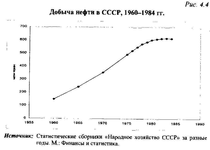 Масштабы наращивания нефтедобычи в СССР в эти годы необычно высоки в истории отрасли (см. рис. 4.4). Многие из вводимых в эксплуатацию месторождений по международной классификации относились к категории уникальных, дающих аномально высокий дебит скважин.
