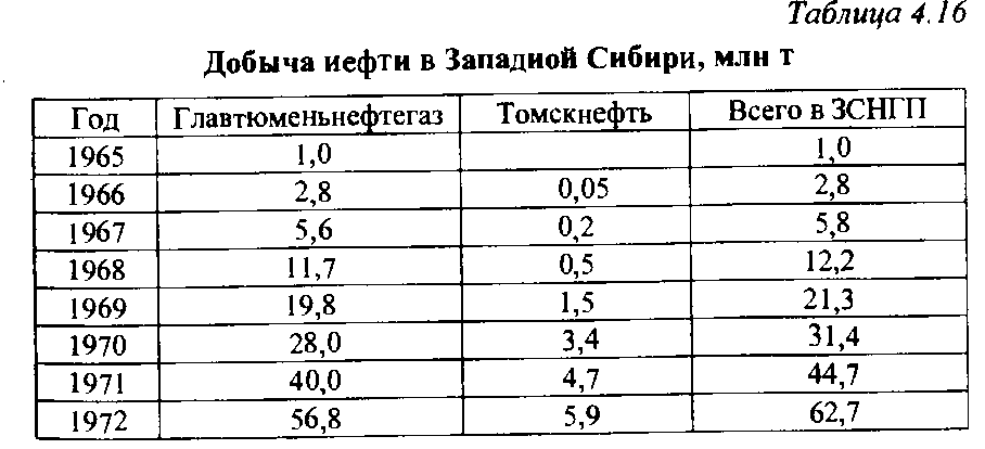 Первый газовый фонтан в Западной Сибири был открыт в сентябре 1953 г.[290] Масштабные геологические находки приходятся на 1961-1965 гг. В 1961 г. были открыты Мегионское и Усть-Балыкское месторождения, в 1963 - Федоровское, в 1965 - Ма-монтовское и Самотлор. Для вводимых в действие месторождений были характерны высокие дебиты добычи, как правило, превышающие 100 т. в сутки на одну скважину, доступные глубины 1,8-2,5 км[291]. В 1972-1981 гг. добыча нефти в Западно-Сибирской нефтегазовой провинции (ЗСНГП) возросла с 62,7 до 334,3 млн т. (в 5,3 раза, см. табл. 4.16).