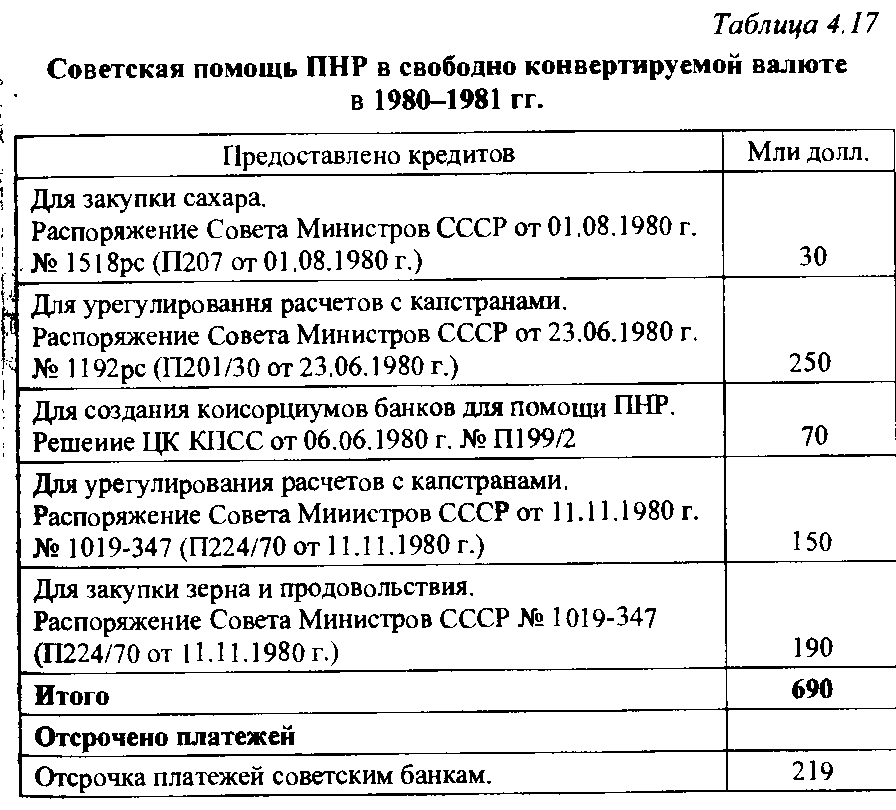 Секретариат ЦК КПСС 4 октября 1980 г. рассматривает вопрос о влиянии польских событий на развитие внутриполитической ситуации в СССР. В подготовленных аппаратом ЦК КПСС материалах сказано: «Анализ буржуазной пропаганды, в частности, радиопередачи на Советский Союз, в связи с польскими событиями показывает, что эти события активно используются в попытках скомпрометировать принципы социализма, прежде всего, поставить под вопрос руководящую роль партии в социалистическом и коммунистическом строительстве. [...] Некоторые негативные процессы в средствах массовой информации Польши свидетельствуют о том, что идеологическая неразбериха там может возрасти и создадутся дополнительные трудности для нашего информационно-пропагандистского воздействия на польское население. Уже обозначилось ослабление контроля со стороны ЦК ПОРП за деятельностью газет, радио и телевидения. Органы печати все чаще публикуют дискуссионные или просто сомнительные материалы, никак не способствующие усилиям руководства ПОРП по стабилизации обстановки». В декабре 1980 г. Секретариат ЦК КПСС предпринимает меры по ограничению распространения информации о событиях в Польше на территории СССР. Главному управлению по охране государственных тайн в печати при Совете Министров СССР поручено изымать из розничной продажи и подписки книги и другие издания, направлять их в спецхранилища. С течением времени платить за внешнеполитическую активность и сохранение империи приходилось все дороже (см. табл. 4.17).