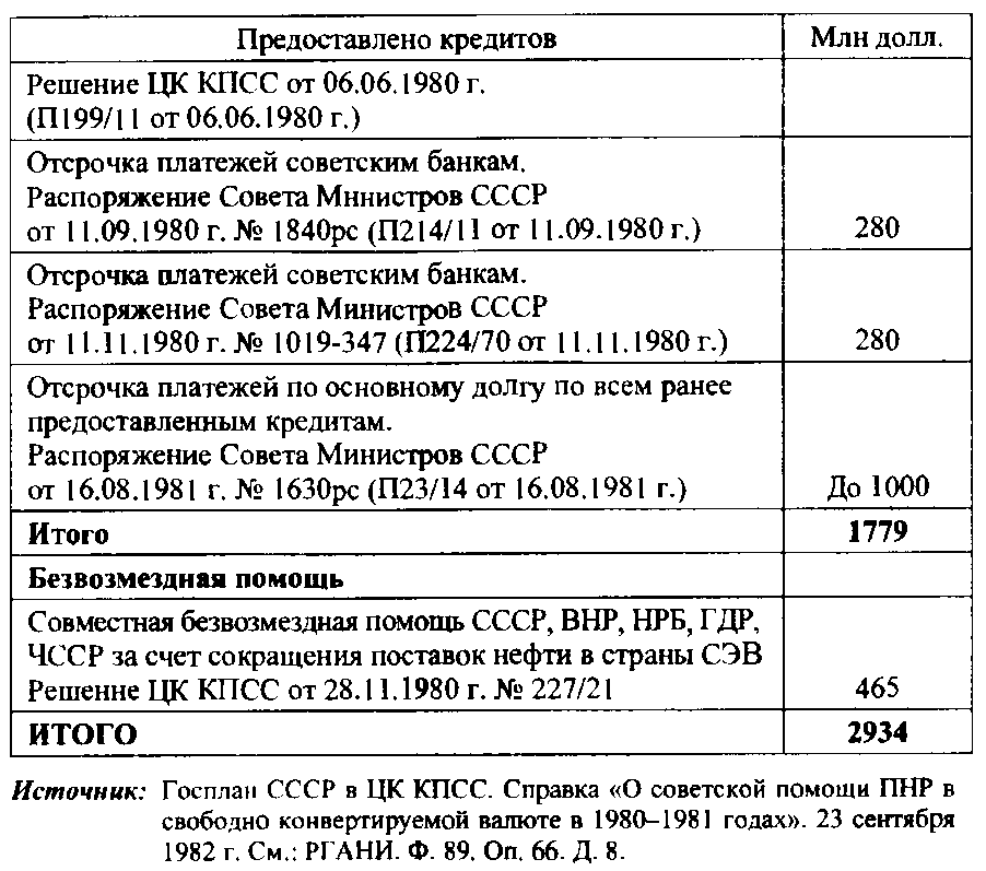 1-2 марта 1982 г. польская партийно-государственная делегация посетила Москву. Во время встречи с советским руководством первый секретарь ЦК ПОРП В. Ярузельский говорит о тяжелом положении польской экономики, о том, что используется лишь 60% промышленного потенциала, для 400 тыс. промышленных рабочих и 200 тыс. строителей стала реальной угроза безработицы. Польские товарищи благодарили Советский Союз за экстренную экономическую помощь, составившую в 1980-1981 гг. около 4 млрд переводных руб., в том числе, около 3 млрд долл. в валюте. Была достигнута договоренность о предоставлении Польше на 1982-1983 гг. советского кредита в размере 2,7 млрд руб. Польская делегация поставила вопрос об оказании дополнительной широкомасштабной экономической помощи.