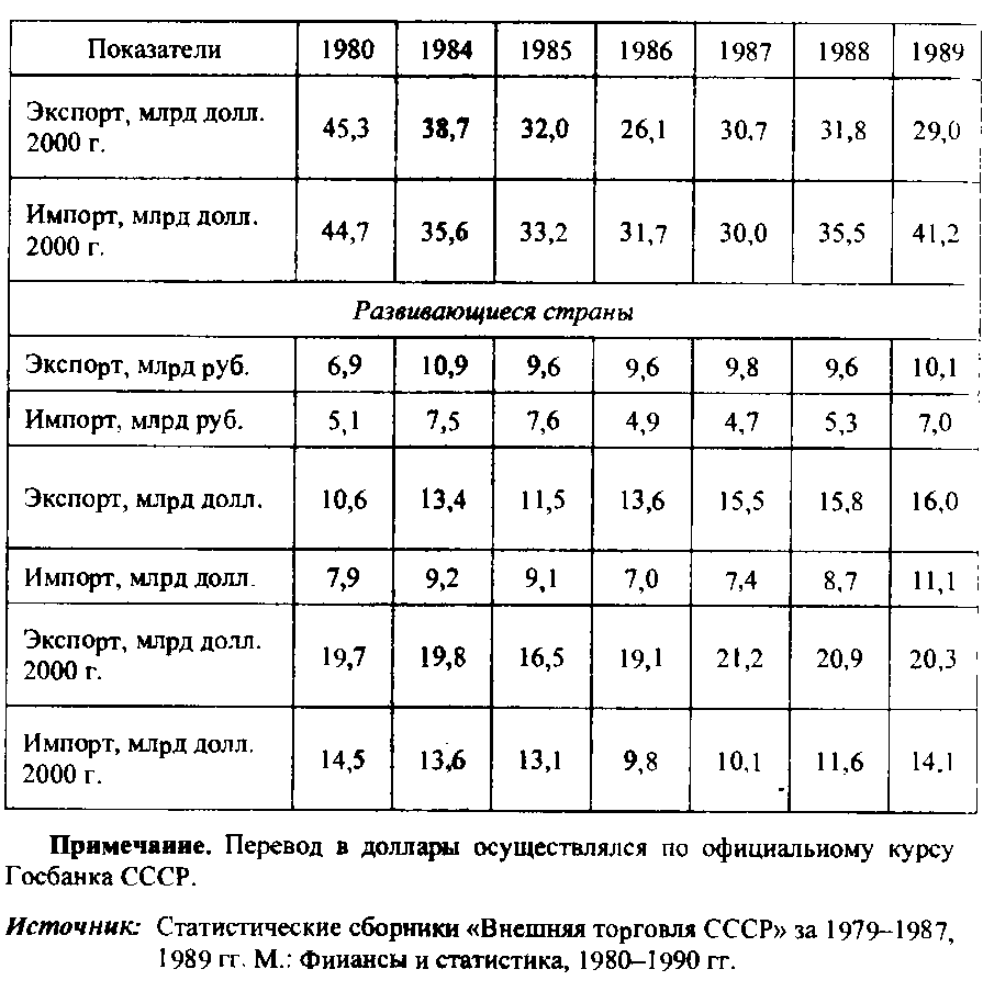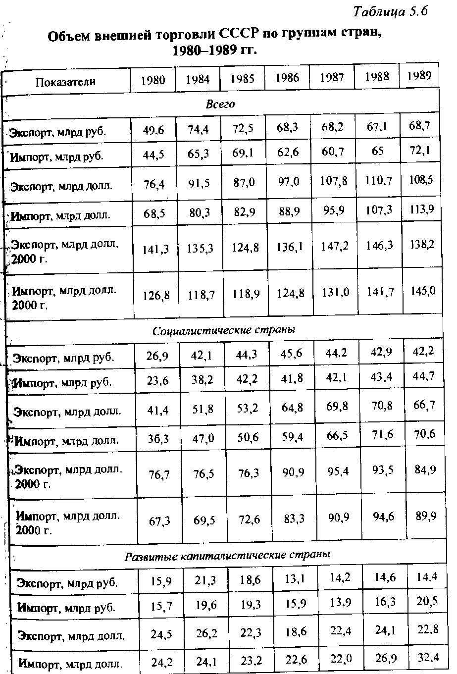 Вот что пишет о развитии событий в советской экономике середины 1980-х годов Н. Рыжков, возглавлявший тогда Совет Министров СССР: «В 1986 г. на мировом рынке произошло резкое снижение цен на нефть и газ, а в нашем экспорте традиционно был высокий удельный вес энергоносителей. Что было делать? Самое логичное - изменить структуру экспорта. Увы, сделать это достаточно быстро могли лишь самые экономически развитые страны. Наши же промышленные товары были на мировом рынке неконкурентоспособны. Возьмем, например, машиностроение. Объем экспорта его продукции по сравнению с 86 годом не изменился, но ведь шла она практически только в страны СЭВ. Капиталисты брали едва ли 6% от всего машиностроительного экспорта. Вот почему мы и вывозили в основном сырье»[325].