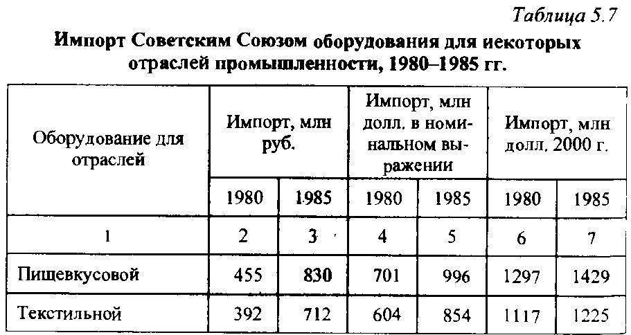К моменту, когда Советский Союз столкнулся с внешнеэкономическим шоком середины 1980-х годов, он был тесно интегрирован в мировой рынок (см. табл. 5.6), был не только экспортером топливных ресурсов, но и крупнейшим в мире импортером зерна и одним из крупных импортеров продовольственных товаров. С социально-политической точки зрения сокращение потребления продуктов питания по сравнению с привычным уровнем, - опасно для власти в любом обществе. Тем не менее, если нет возможности в значительном масштабе нарастить экспорт товаров, не связанных с нефтью, или сократить импорт товаров, закупаемых на конвертируемую валюту, - а они к этому времени определяют условия работы многих отраслей российской экономики (см. табл. 5.7), в том числе не связанных с продовольствием, такое решение приходится принимать. В противном случае оно будет реализовано автоматически после исчерпания золотовалютных резервов и возможностей привлечения внешних кредитов.