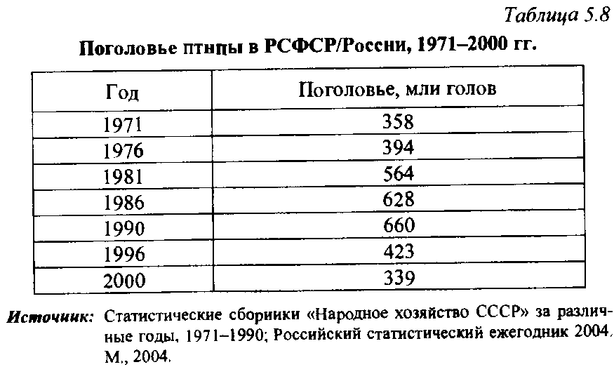 Противоречие между экономической неизбежностью и политической невозможностью осуществления стабилизационной программы - суть происходившего в СССР в конце 1980-х годов. Развитие событий в рамках жесткого сценария адаптации к внешнему шоку, связанному с падением нефтяных цен, иллюстрируют данные по одной из отраслей - птицеводству (см. табл. 5.8). Эта отрасль производства в СССР с начала 1970-х годов практически полностью зависела от массовых закупок кормового зерна по импорту. За ростом поголовья в период высоких цен на нефть, - последовало его резкое сокращение в то время, когда цены упали. Этот процесс должен был начаться уже в 1986 г. Его отсрочка до 1990 г. была обеспечена ценой быстрого роста внешнего долга. После исчерпания валютных резервов и возможностей внешних заимствований, поголовье птицы сократилось до уровня, который предшествовал началу массового зернового импорта.
