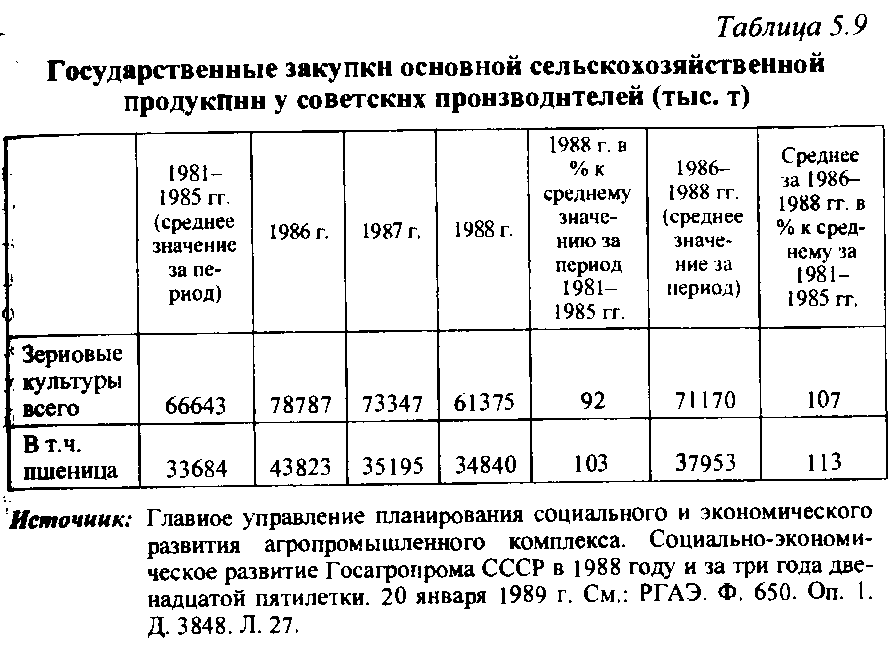 Когда цены на нефть падают, резко сократить импорт важнейших продовольственных товаров, в том числе зерна, невозможно. Поддерживать на прежнем уровне - тоже. Хорошие урожаи, обусловленные погодными условиями 1986 и 1987 гг., позволили советскому руководству сгладить последствия резкого падения цен на нефть, увеличить объем заготовок внутри страны, временно сократить закупки зерна за конвертируемую валюту. Расходы на его импорт снизились на 2-3 млрд долл. Однако 1988 г. показал, что это лишь короткая передышка (см. табл. 5.9).