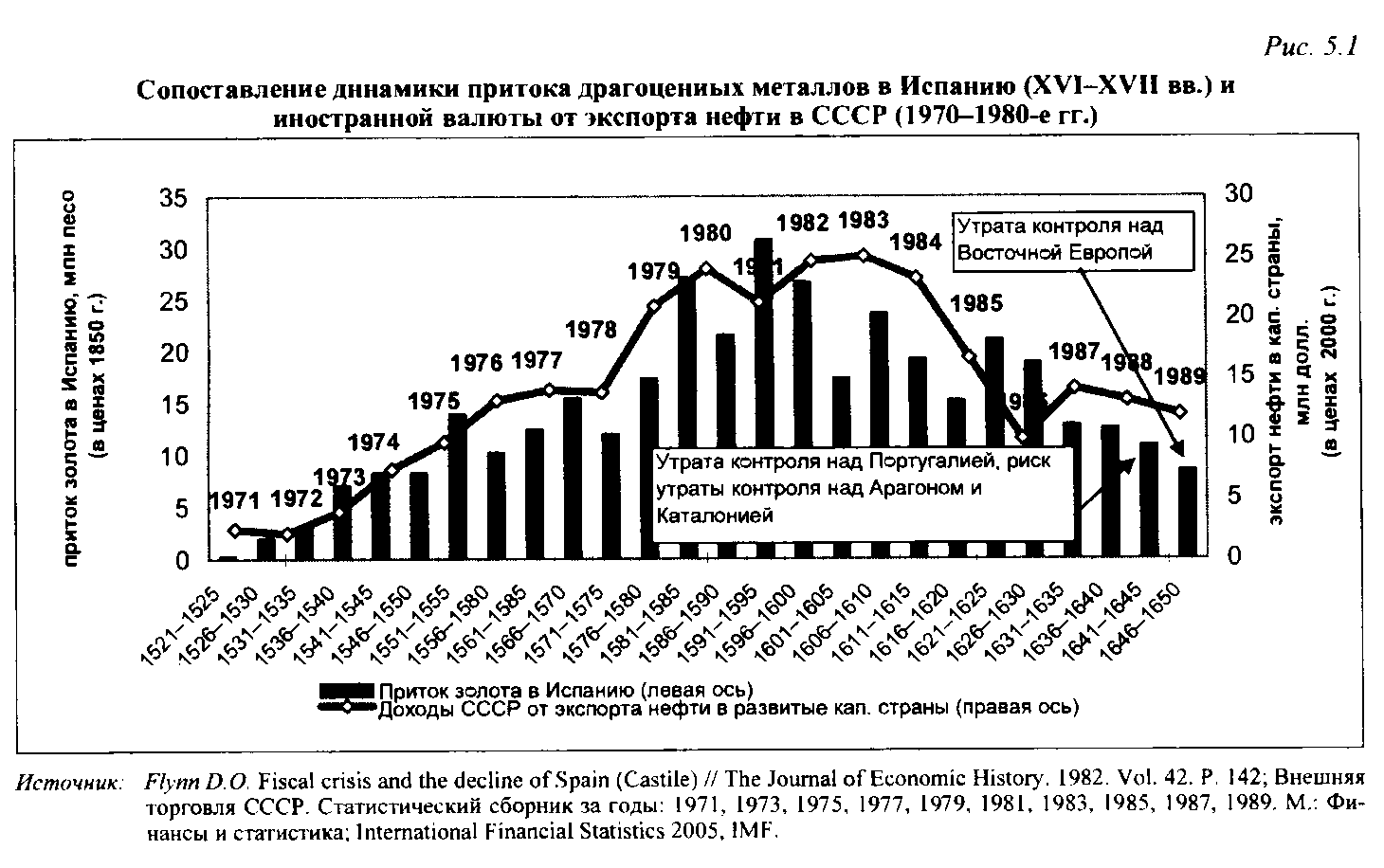 Зависимость урожаев от погодных условий, связанная в том числе с принятым в 1950-х годах решением об освоении целинных земель, как приоритете в аграрной политике, а также сохранившиеся низкие цены на нефть сделали ситуацию с внешнеторговым балансом СССР катастрофической. В этом, а отнюдь не в дачных качествах М. Горбачева и просчетах его команды, - первопричина кризиса советской политико-экономической конструкции[327] Пойти на меры, необходимые для управления кризисом, значило создать угрозу не только для действующего руководства СССР, но и для всего коммунистического режима. Отказ от них, в случае, если изменение внешнеэкономической конъюнктуры носят долгосрочный характер - делало крах социалистической экономики и советской империи неизбежным. Параллели произошедшего в Испании в XVI-XVII вв. (см. выше, гл. 3) и того, что Происходило в Советском Союзе в конце XX века, слишком очевидны, чтобы их можно было