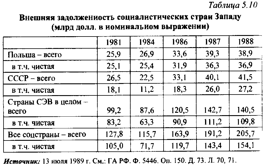 Сокращение поставок нефти и нефтепродуктов социалистическим странам с середины 1980-х годов, перераспределение нефтяного экспорта в пользу импортеров, способных рассчитываться конвертируемой валютой, становится регулярной практикой. Между тем долги социалистического лагеря растут. К 1988 г. внешняя задолженность социалистических стран в свободно конвертируемой валюте Западу составила 206 млрд долл. Объем чистой задолженности увеличился до 154,1 млрд долл. (см. табл. 5.10).