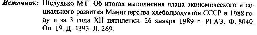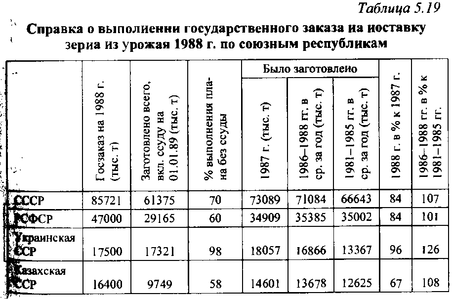 Министерство хлебопродуктов в правительство: «По состоянию на 1 января 1989 года в государственные ресурсы поступило 61,3 млн. тонн зерна при плане 85,7 млн. тонн. Государственный заказ недовыполнен на 30%, в том числе по РСФСР - 40%, Казахской ССР - 42% и Эстонской ССР - 52%. К уровню 1987 года снижение заготовок составило 11,9 млн. тонн или 16%, в том числе пшеницы заготовлено меньше на 217 тыс. тонн, ржи - на 860 тыс. тонн, гречихи - на 179 тыс. тонн, проса - на 551 тыс. тонн, зернобобовых - на 458 тыс. тонн, ячменя - на 7186 тыс. тонн и овса - на 928 тыс. тонн, [...] В ряде областей при наличии в хозяйствах значительного количества намолоченного зерна имели место факты сдерживания продажи его государству»[373].