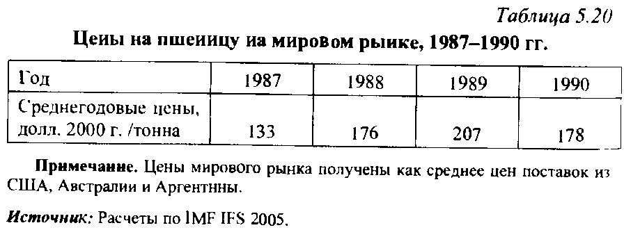 В 1989-1990-х годах на нарастающий кризис торгового баланса СССР накладывается еще один параметр - низкие урожаи зерновых в мире, превышение мирового спроса над предложением, формирование рынка продавца. Особенно сильно выросли цены на пшеницу (см. табл. 5.20).