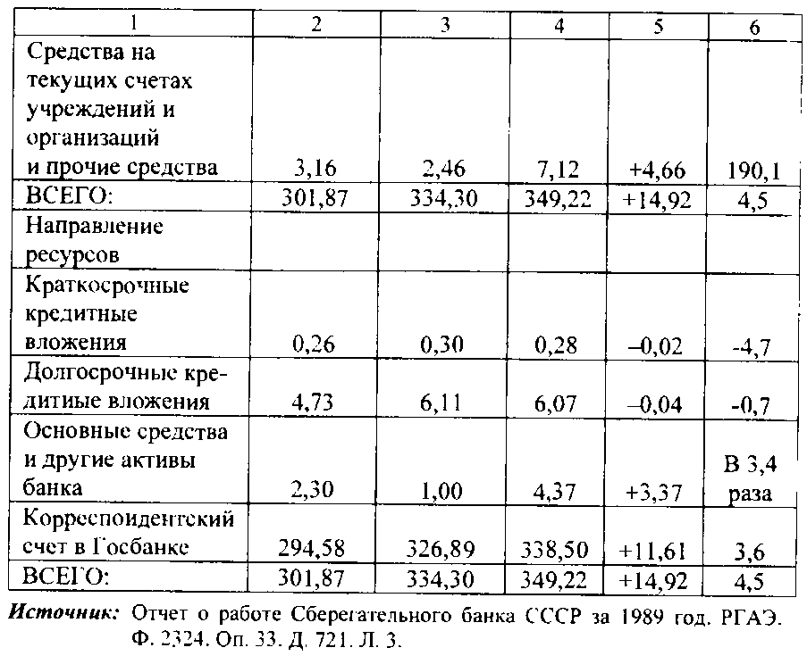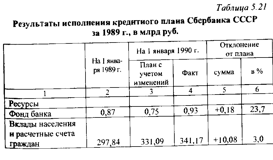 На этом фоне Сбербанк СССР отчитывается перед правительством о рекордных масштабах привлечения вкладов населения: «В отчетном году учреждения Сберегательного банка СССР привлекли во вклады, сертификаты, облигации государственного займа и билеты денежно-вещевых лотерей 45,6 млрд. руб. или на 23,5 млрд. руб. больше объемов, предусмотренных в плановом балансе денежных доходов и расходов населения на этот год. Решающее влияние на столь активный процесс привлечения средств населения в учреждения банка оказало превышение темпов роста денежных доходов населения (на 64 млрд. рублей или 12,9%) по сравнению с ростом расходов на товары и услуги (на 9,1%). В целом за 4 года текущей пятилетки остаток средств населения на счетах по вкладам увеличился на 117,1 млрд. руб. или на 53%. Такой высокий темп роста сбережений был обусловлен тем, что денежные доходы населения выросли на 32,7%, а расходы на покупку товаров и оплату услуг - лишь на 23,9%. Среднегодовые темпы прироста доходов населения за 1986-1989 гг. составили 7,3%, расходов на покупку товаров и оплату услуг - 5,5%, прироста вкладов 22,2%». Как видно из данных табл. 5.21, учреждения Сберегательного банка обеспечили перевыполнение плана по привлечению средств населения и по размещению их через Госбанк СССР на цели, определенные Советом министров СССР[384].