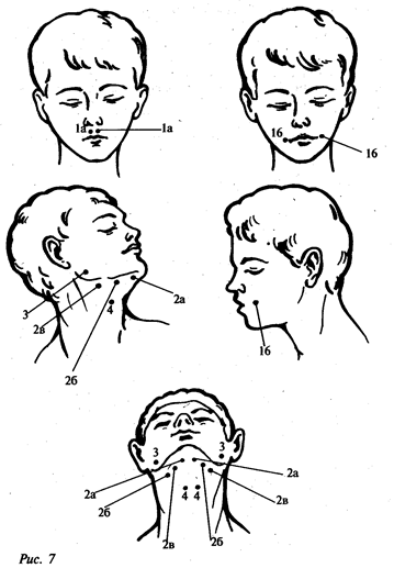 Заслуживает внимание точечная электростимуляция артикуляционных мышц по методу Л.А. Щербаковой, применяемая при дизартрии у детей с ДЦП (лечение методом физиотерапии). Приводим схему расположения точек при точечной электростимуляции (метод Щербаковой Л.А.). (рис. 7)