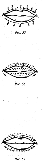 Растирающие движения следует производить указательными пальцами обеих рук. Губы должны растягиваться, иребенок должен ощущать легкое покалывание в губах. Растирающие движения выполняют 4–6 раз, 2–3 раза в день (рисунок № 54).