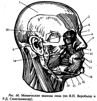 1 – черепной апоневроз: 2 – лобная мышца; 3 – часть области век круговой мышцы глаза; 4 – глазничная часть круговой мышцы глаза; 5 – медиальная связка век; 6 – латеральная сухожильная полоска; 7 – мышца гордецов; 8 – мышца, сморщивающая бровь; 9 – собственно носовая мышца; 10 – мышца, осаждающая перегородку носа; 11 – круговая мышца рта; 12 – мышца, поднимающая верхнюю губу (средняя линия); мышца, поднимающая верхнюю губу и крыло носа (медиальная линия); малая скуловая мышца (латеральная линия); 13 – большая скуловая мышца; 14 – мышца, поднимающая угол рта; 15 – верхняя резцовая мышца; 16 – мышца, поднимающая нижнюю губу; 17 – мышца, опускающая угол рта; 18 – подбородочная мышца; 19 – щечная мышца; 20 – ушные мышцы