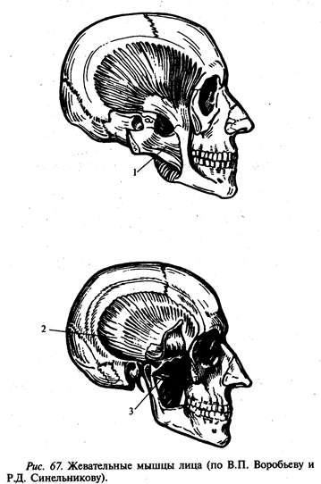 Приводим рисунки № 66 и 67, показывающие расположение мимических и жевательных мышц.